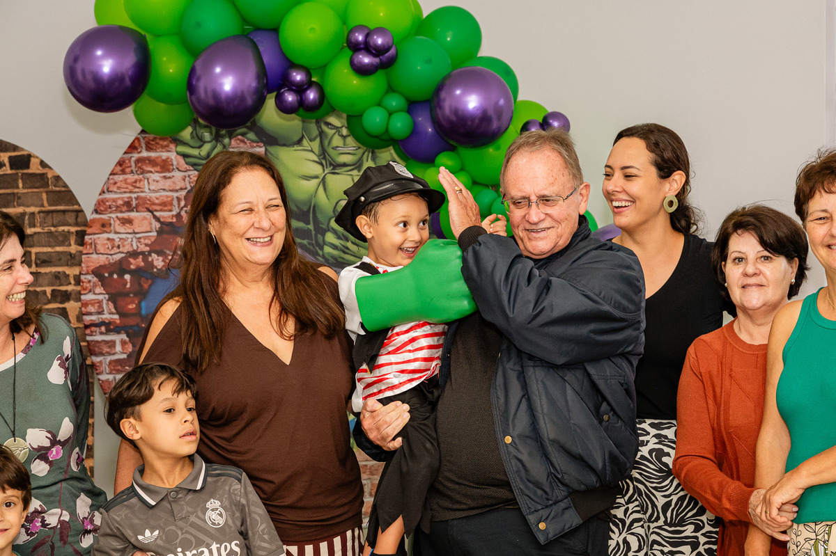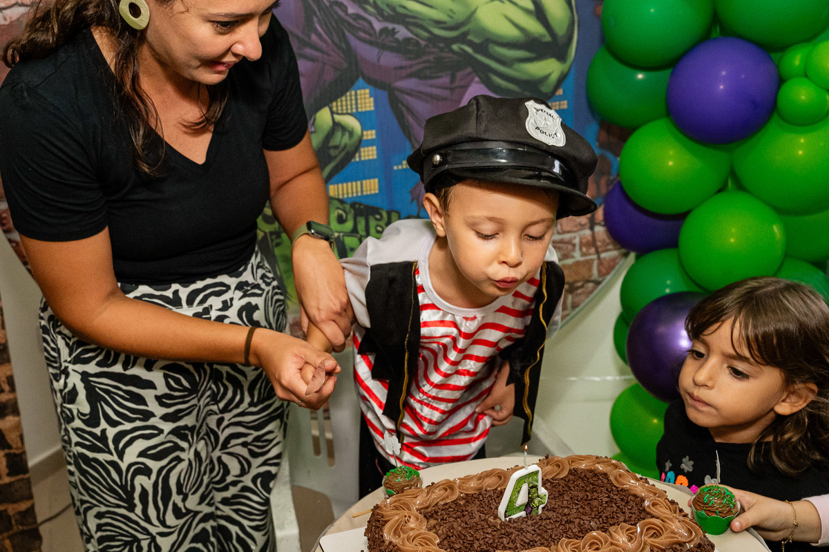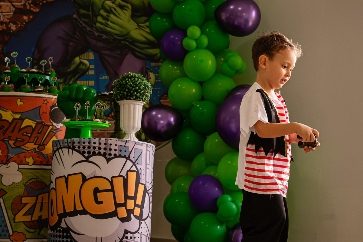 Com o tema do Hulk, a festa ganhou ainda mais personalidade. Cada detalhe trouxe o universo desse herói tão forte e cheio de atitude, combinando perfeitamente com a fase cheia de descobertas, imaginação e intensidade que é a infância.